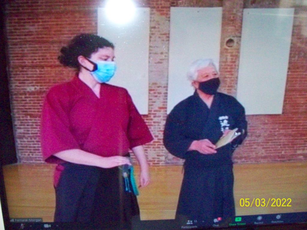 Carole Galligan Sensei (6dan, Renshi) First presenter. Kata 1 to 3 Seitai IaiOhmi Goyo Sensei (7dan, Kyoshi) Second Presenter and Pamurai – Kata 4 to 6 Seitai Iai(Need name for caption)Third Presenter Kata 7 to 9 Seitai IaiPamela Morgan: Zoom technician, Organizer Demonstrator!! 🙂